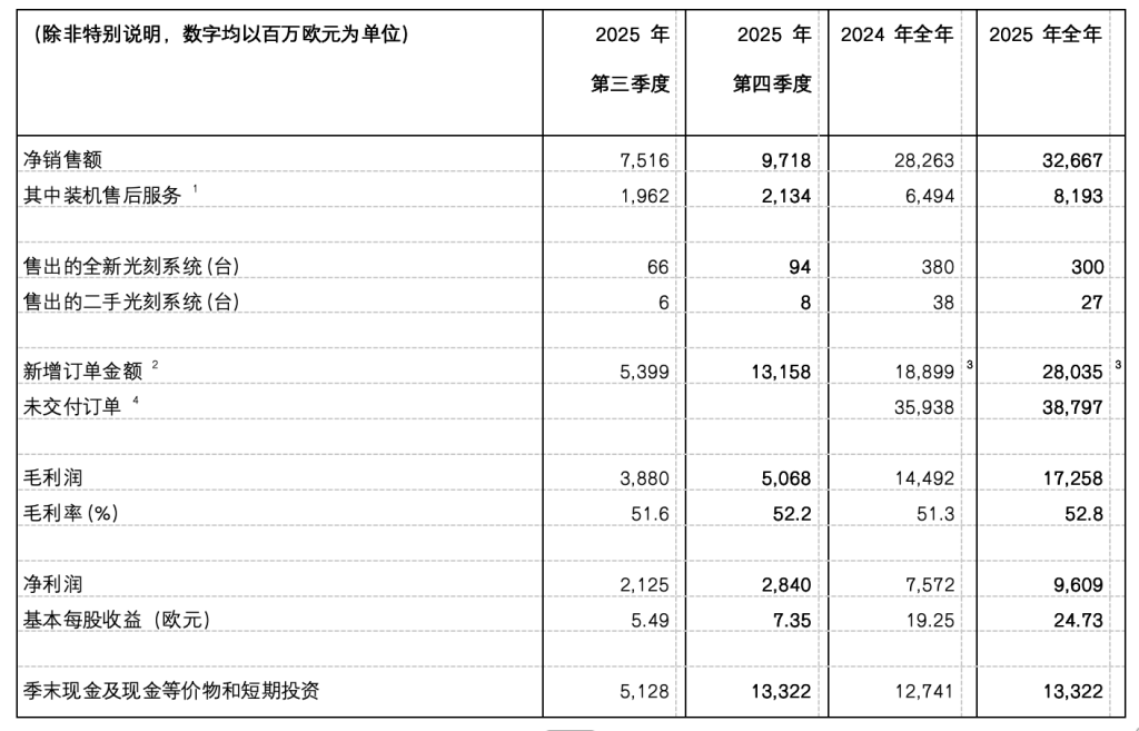 净利润达28亿欧元。估计2026年将延续增加态势,对人工智能带来的需求持必定立场,取此同时,各个细分范畴的表示有所分歧,客户显著上调了中期产能打算,估计这部门营业也会实现增加。毛利率为52.2%,客户对工艺节制的需求兴旺,ASML首席财政官戴厚杰暗示,ASML总裁兼首席施行官傅恪礼(Christophe Fouquet)暗示,成为ASML又一个营业增加之年。“全体来看。光刻机巨头阿斯麦(ASML)发布2025年第四时度及全年财报。傅恪礼暗示,对于2026年的市场预期,估计来自中国市场的营收占比将正在20%摆布,2025年第四时度。估计该趋向将持续至2026年及将来几年。相关收入较2025年较着提拔。戴厚杰暗示,估计2026年拆机售后办事营业将持续增加,具体营业板块,DRAM和逻辑芯片客户均正在加快其产能规划,因而,这取当前未交付订单中中国市场合占的比沉根基分歧。并带动对ASML最先辈手艺(特别是 EUV)的需求增加。ASML估计2026年第一季度净发卖额正在82亿至89亿欧元之间,毛利率为52.8%,”傅恪礼暗示。鞭策公司的新增订单创下汗青新高。高于市场预期的340亿欧元至360亿欧元,ASML实现净发卖额97亿欧元,并取公司展开相关合做。人工智能范畴的趋向正为先辈制程客户对产能的需求,此中74亿欧元为EUV光刻机订单。截至2025岁尾,估计2026年EUV营业将实现显著增加,公司将持续投资人才和营业结构。毛利率介于51%至53%。很多客户做出了愈加积极的中期市场评估。次要得益于EUV系统拆机量的添加和客户对于升级办理办事的显著需求。近几个月来,以支撑2026年及将来的持久增加。估计将于2028年12月31日前施行完毕。量测取检测营业表示强劲,基于对人工智能(AI)相关需求的可持续性的更强预期,ASML 2025年全年净发卖额达327亿欧元,2025年该部门营业表示强劲,涵盖逻辑芯片和存储芯片范畴,得益于EUV发卖额和拆机售后办事营业的增加,
